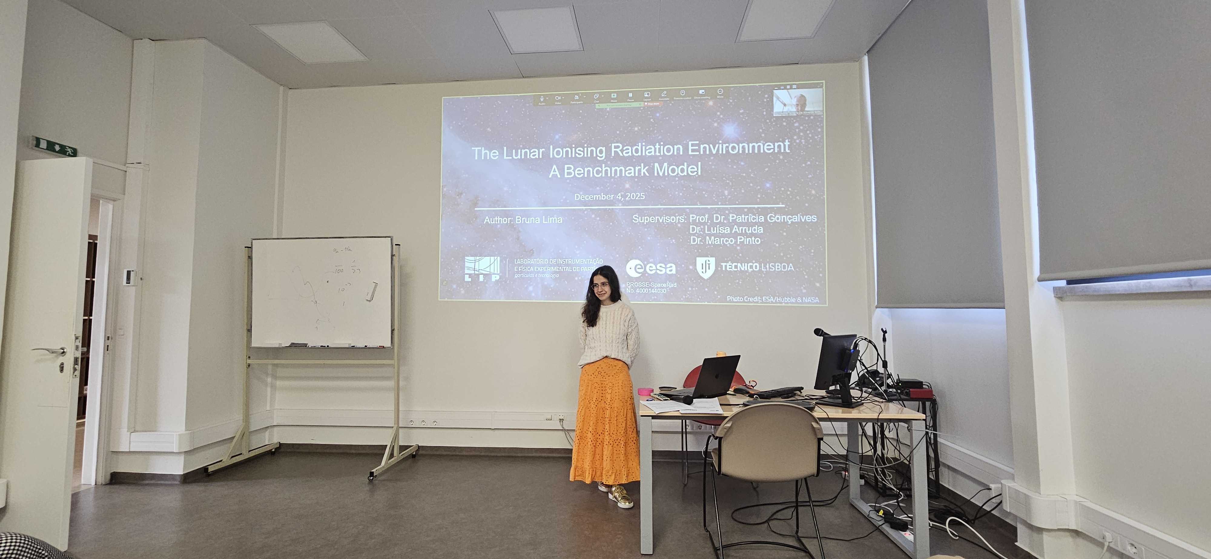 No mesmo dia, Bruna Lima, estudante do Instituto Superior Técnico e membro do grupo SpaceRad do LIP, defendeu a sua dissertação de mestrado intitulada "The Lunar Ionising Radiation Environment - a benchmark model". O trabalho foi orientado por Patrícia Gonçalves (LIP/IST), com coorientação de Luísa Arruda e Marco Pinto (LIP), e obteve a classificação final de 19 valores. A defesa decorreu na Sala de Seminários do LIP, com ligação por Zoom ao IST, à ESA e a Coimbra. O modelo LUNAIRE, desenvolvido por Bruna em Geant4, foi validado com dados do CRaTER a bordo da Lunar Reconnaissance Orbiter e apresenta potencial para aplicação em futuras missões lunares.