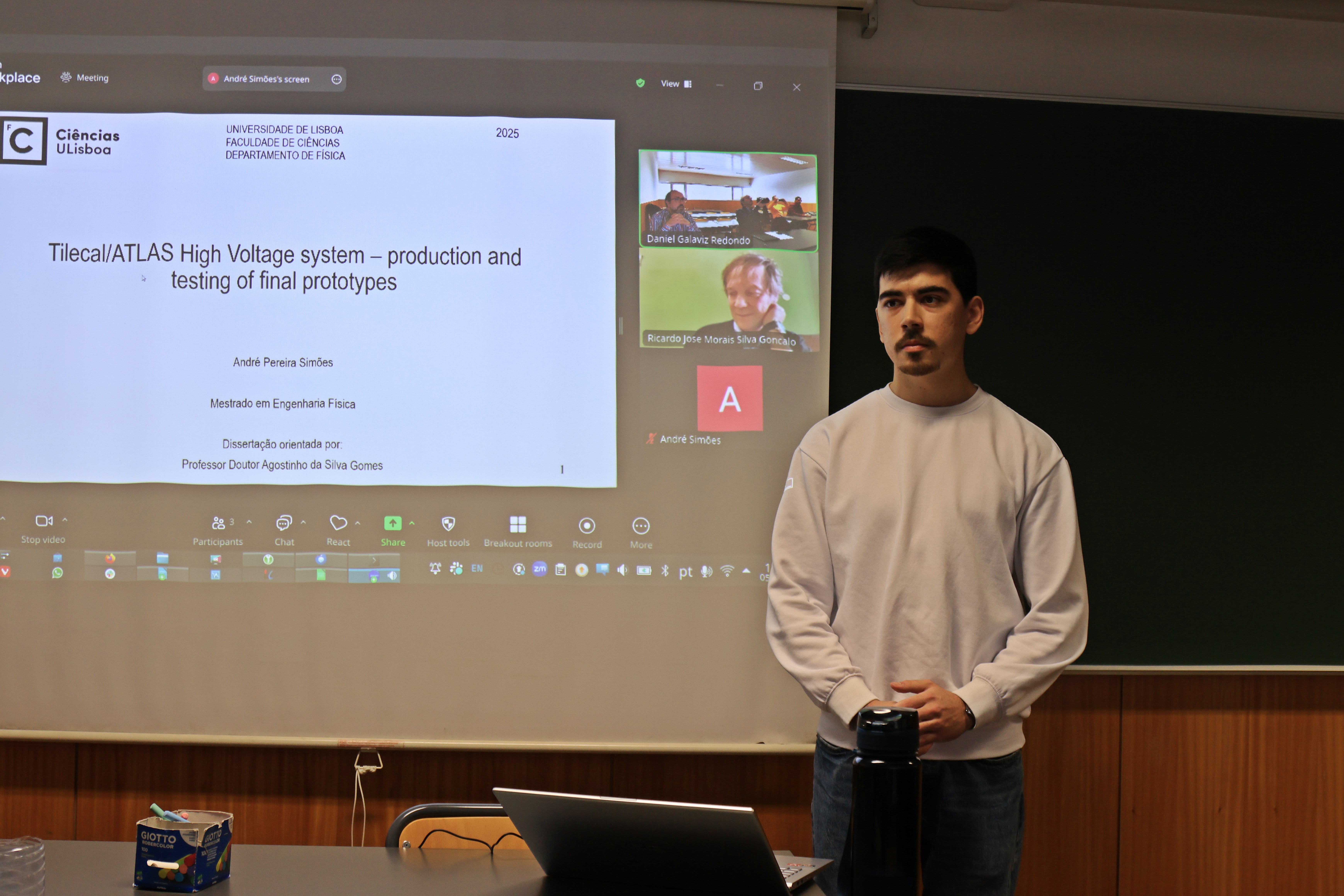 A 5 de dezembro de 2025, André Simões, estudante da FCUL e membro do grupo ATLAS do LIP, defendeu a sua dissertação intitulada "Tilecal/ATLAS High Voltage system – production and testing of final prototypes". O trabalho enquadra-se no upgrade do Tilecal para o HL-LHC e foi orientado por Agostinho Gomes (LIP/FCUL), tendo obtido a classificação final de 19 valores. A defesa contou com a participação de Ricardo Gonçalo e Daniel Galaviz como membros do júri.