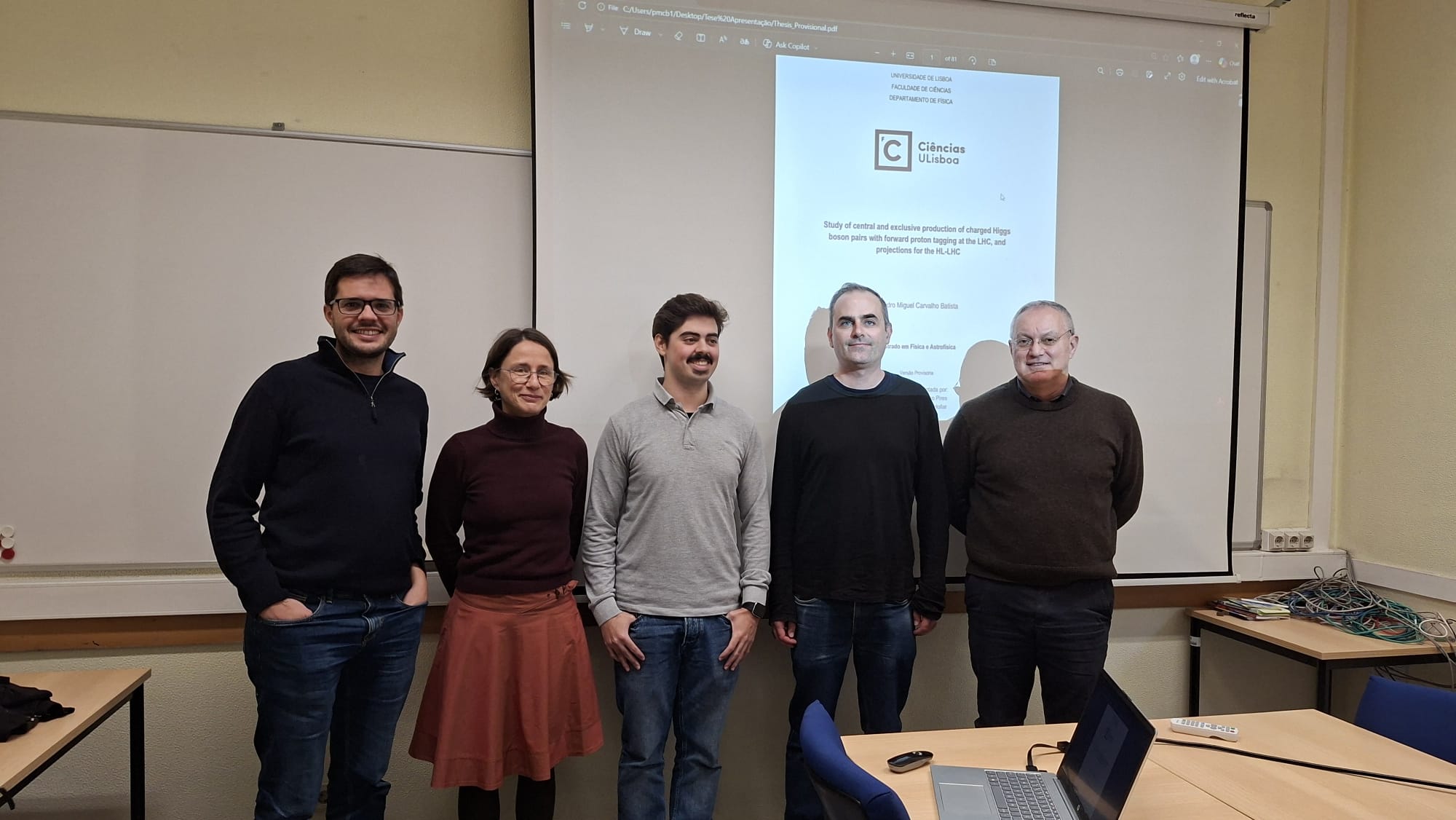No dia 4 de dezembro de 2025, Pedro Batista, estudante do Mestrado em Física na Faculdade de Ciências da Universidade de Lisboa e membro do grupo CMS do LIP, defendeu com sucesso a sua tese intitulada "Study of central and exclusive production of charged Higgs boson pairs with forward proton tagging at the LHC, and projections for the HL-LHC". O trabalho foi orientado por Jonathan Hollar (LIP) e coorientado por João Pires (FCUL, LIP), tendo o júri sido constituído por Patrícia Conde Muiño, Jonathan Hollar e Francisco Lobo. O trabalho de Pedro, classificado com 19 valores, estudou a produção de pares de bosões de Higgs carregados em cenários BSM, com o objetivo de identificar sinais de nova física no setor do Higgs.