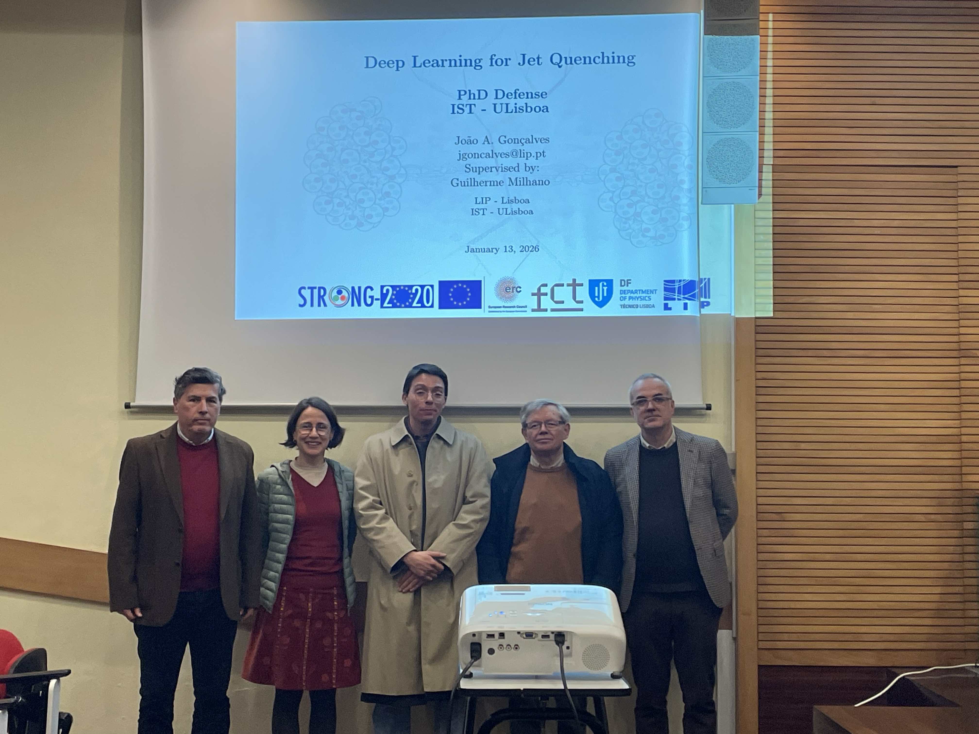 No dia 13 de janeiro de 2026, João Pedro Arruda Gonçalves defendeu com sucesso a sua tese de doutoramento, “Deep Learning for Jet Quenching”, no Instituto Superior Técnico da Universidade de Lisboa, tendo sido aprovado com distinção.