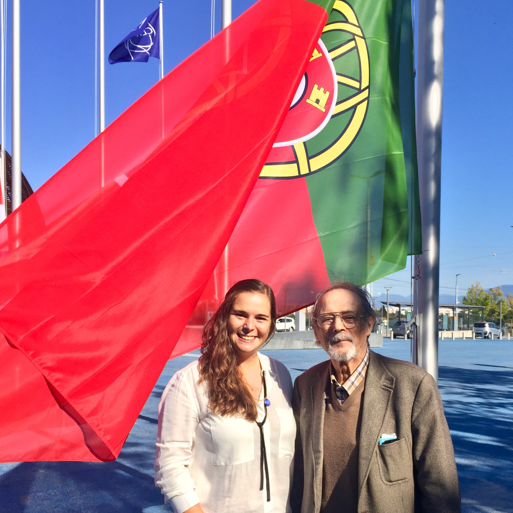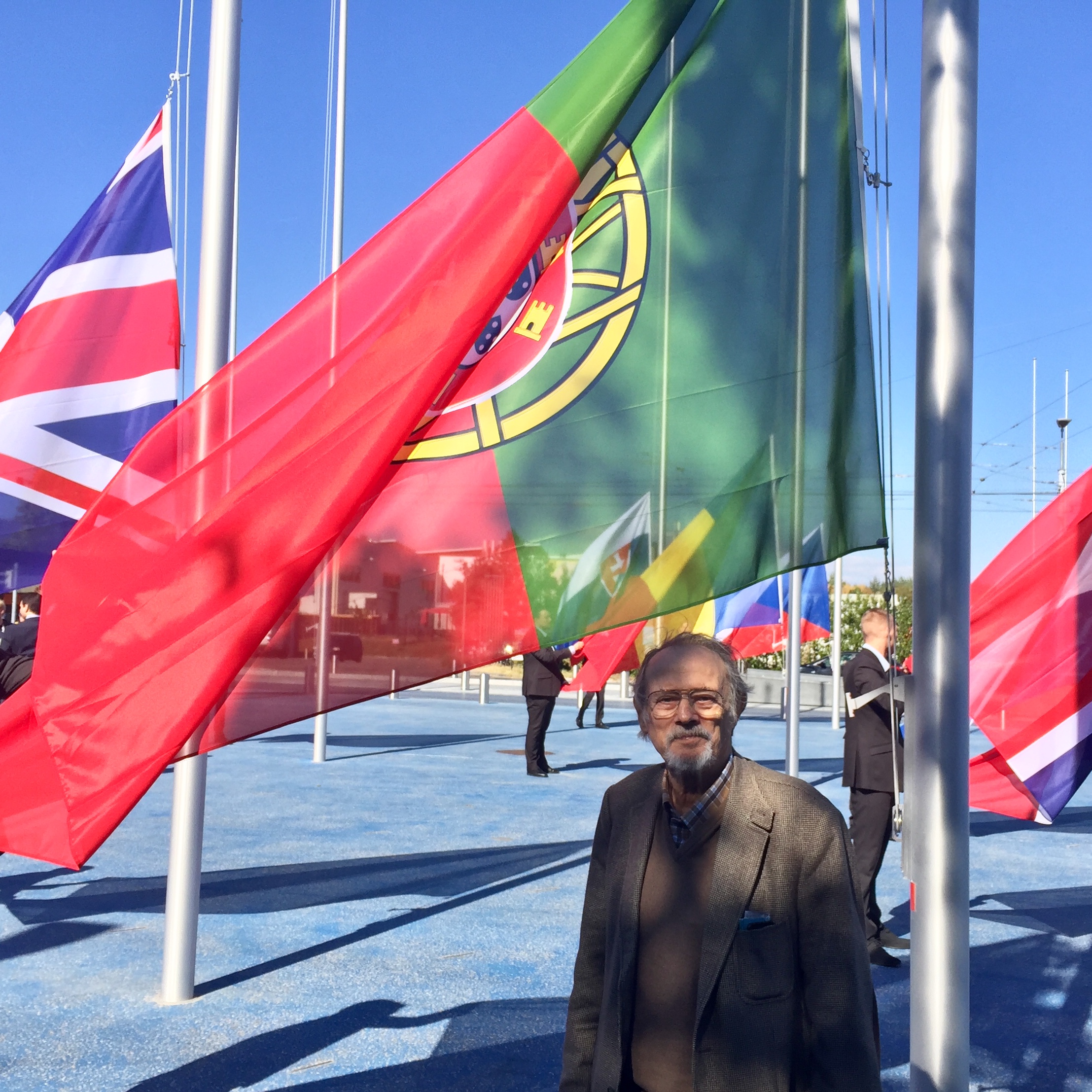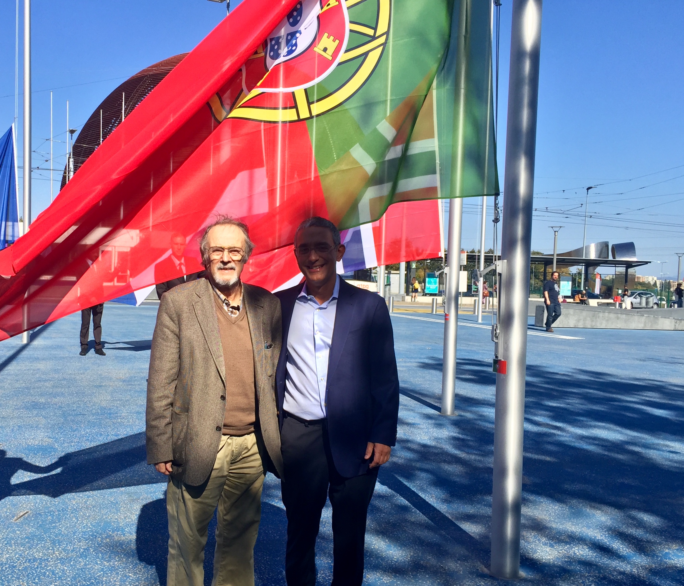 After a long period of construction works, the Esplanade des Particules, in front of the Meyrin CERN site, was inaugurated today, and the flags of the Members States were raised, among them Portugal. In the pictures, Gaspar Barreira, Portuguese Delegate to the CERN Council, and Paulo Gomes, CERN's liaison for Portugal, and Rita Ferreira (Trainee of the FCT programme for young engineers), who particited in the rising of the flag. CERN celebrated 60 years of Science for Peace and remains a symbol of worldwide cooperation, for science and for the common good.