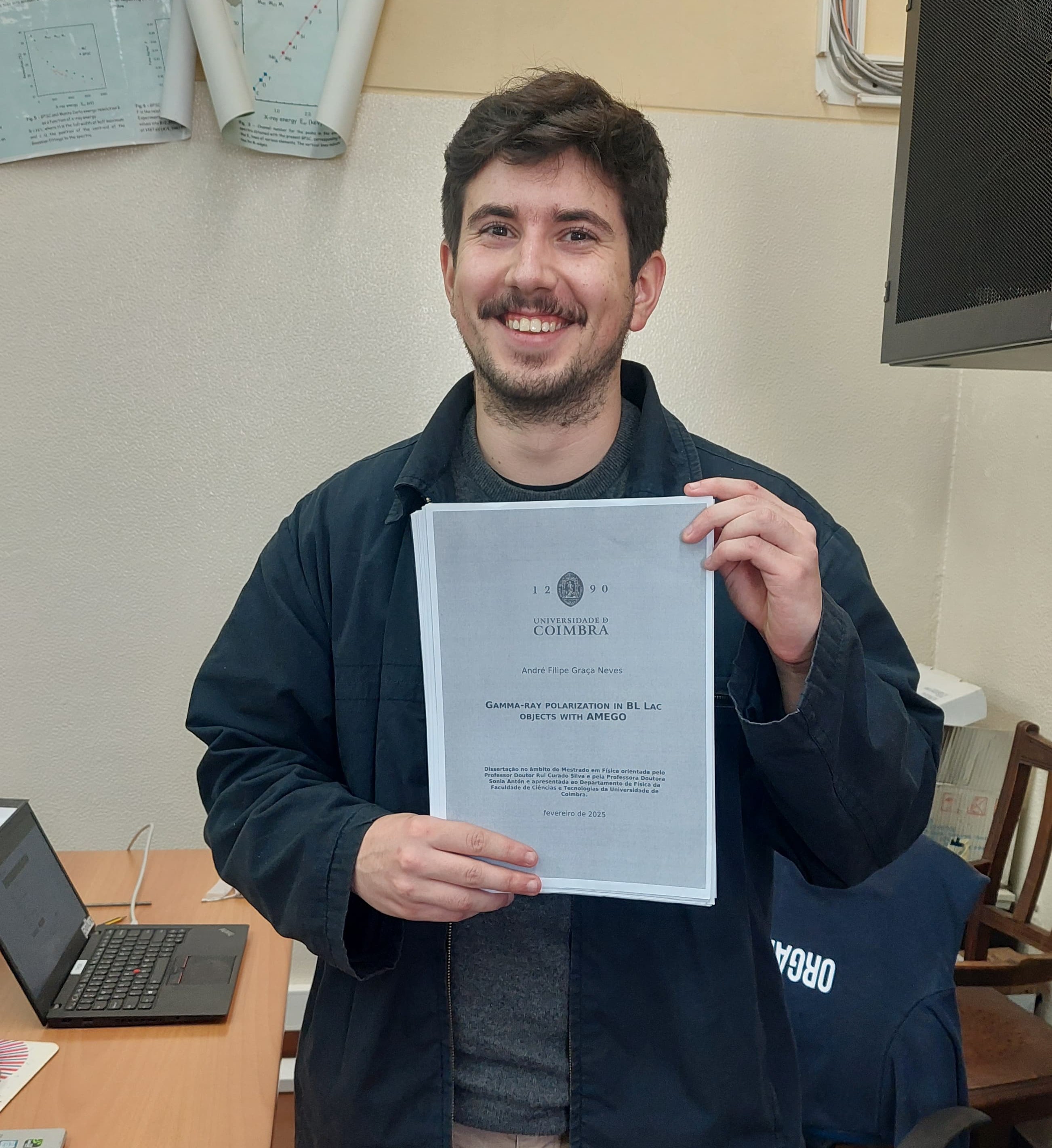 Na primeira semana de março de 2025, André Neves, aluno do Mestrado em Física da Universidade de Coimbra (UC) e membro do grupo i-Astro do LIP, realizou com sucesso a defesa do seu projeto de tese, intitulado "Gamma-ray Polarization in BL Lac Objects with AMEGO".