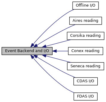 The Event backend includes the codes for reading and writing real and simulated data in various formats as well as reading generator-level simulated showers produced by different air shower simulation programs.The event representation in memory is decoupled from the representation on disk. When a request is made to write event contents to file, the data are transferred through a so-called file interface to a data structure which is instrumented with machinery for serialization, and which can be optimized for access speed. Similarly, when data are requested from file, a file interface reads the data and relays it to the appropriate part of the event interface.At present, serialization is implemented using the ROOT, though the design is intended to allow for relatively straightforward changes of serialization machinery.A set of simple-to-use input/output modules are provided to allow users to transfer all or part of the event from memory to a file at any stage in the processing, and to reload the event and continue processing from that point onward. These modules are built upon a set of utilities to support the multi-format reading and writing required to deal with different raw event and monitoring formats as well as the different formats used by the various air shower simulation packages.Here is a diagram of the event input/output mechanism.